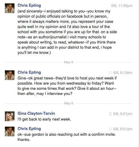 Then, October 21, a moderator for the OVSD Facebook Forum shared these messages (among others) with another moderator after indicating in the message thread that he’d just had a phone call with Clayton-Tarvin.