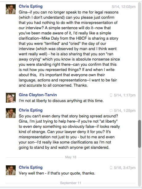 That was the last response I have ever received from Gina Clayton-Tarvin; May 14, 2015.