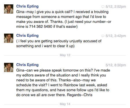 A smear was beginning to take place, I was concerned, and so I contacted Gina. I was concerned for her reputation as well as mine. This was what I wrote: